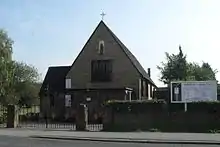 Bingham Towner's 1954–55 church, a "pleasant little building"[31] of yellowish-buff brick, with a steep shingled roof[31][41] and designed in the Vernacular style, was small and unpretentious: Nikolaus Pevsner described it as "modest indeed", even after its porch and sacristy were added in 1966.[42] The "fine oak porch"[41] gave some more emphasis to what was "just a simple rectangular box". The mullioned leaded light windows gave an unecclesiastical appearance reminiscent of a Tudor Revival house.[31]