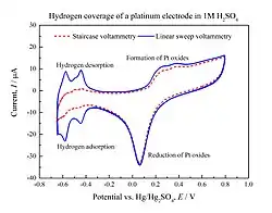 Comparison of the current response of a platinum disc electrode in 1 M sulphuric acid given by linear sweep voltammetry and staircase voltammetry methods.