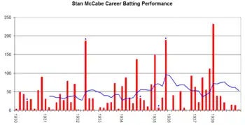 Stan McCabe's Test career batting performance. The red bars indicate the runs that he scored in an innings, with the blue line indicating the batting average in his last ten innings. The blue dots indicate an innings where he remained not out.[29]