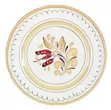 Upon Fulper's death in 1928, Stangl became president of the company and only the Stangl Pottery line was produced after 1935. From 1929 and onward, the pottery had the marking Stangl or Stangl USA. In addition to dinnerware, Stangl was known for its line of bird figurines which were sold from the 1940s to the 1970s.[3] The bird figurines were called the Birds of America series and their designs were based on illustrations by John James Audubon.[2] The designs of Stangl dinnerware were created by Kay Hackett, and featured folk art designs based on Pennsylvania Dutch motifs and nature such as fruit, garden flowers, and thistles. Stangl contributed to the World War II effort by teaching basic techniques to local women so that the company could produce red clay dinnerware. Both the carvers and painters put their initials on the back of the dinnerware.[2]