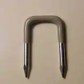 Outward clinch staples are blind staples. There is no anvil, and they are applied with a staple gun.[6] When applied, each staple leg forms a curve bending outwards. This is in part caused by the shape of the crown, which is like an inverted "V", and not flat as in ordinary staples. Also, the legs are sharpened with an inside bevel point, causing them to tend to go outwards when forced into the base material. These staples are used for upholstery work, especially in vehicles, where they are used for fastening fabric or leather to a foam base. These staples are also used when installing fiberglass insulation batts around air ducts- the FSK paper sheathing is overlapped, and the two layers are stapled together before sealing with tape.