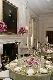 First Lady Jacqueline Kennedy worked with American antiques expert Henry Francis du Pont and French interior designer Stéphane Boudin on the restoration of the State Dining Room.[83] Du Pont and Boudin both recommended that changes should emphasize the earlier work of McKim.[84] Most of Boudin's suggestions for the room mirrored changes he had made to the dining room at Leeds Castle in Kent, England.[85]
