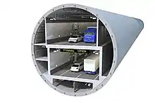 The SR 99 tunnel is a single tube that measures 9,270 feet (2,830 m) long and 52 feet (16 m) wide, carrying a double-decker highway that is 32 feet (9.8 m) wide and has two lanes in each direction.[4][5][6] Each deck has two 11-foot (3.4 m) lanes, an 8-foot (2.4 m) west shoulder, and a 2-foot (0.61 m) east shoulder.[7] The decks are designed with banks of two degrees in turns and four-degree grades to facilitate designed speeds of 50 miles per hour (80 km/h).[8][9] Below the highway decks are utility lines and mechanical spaces for the tunnel's ventilation, lighting, and fire suppression systems.[10]