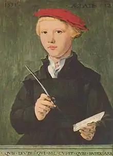 The first rector recorded is 'Meester Gheraerde de scoelmeester' in 1301.[3] In 1389 the city was given the privilege of appointing the rector together with the pastor of the Bavo.[3] The rector was paid by the fees paid by students. He also took in students from outside the city and received extra fees for room & board. From his income, he paid the teachers (ondermeesters) himself.[3] The basis for education was the 'artes liberales', whereby parts of the Trivium were given in Latin and the Quadrivium included music, since the choir boys needed to sing in church.[3] For boys studying theology, Hebrew lessons were given in addition to Latin (Greek only became available from 1522).[3] Students wanting to continue their studies, needed to leave the country before the Leiden University was founded in 1579. According to the archives of the Heilige Geest, a religious institution formerly located at what is now the Hofje van Oorschot, they had a fund from 1502 to 1577 (the Satisfactie) for sending good students to Cologne to further their studies there.[3] In 1553, when the school had been run by Junius, they even petitioned Charles V, Holy Roman Emperor for the right to found a university in Haarlem, but this was never answered.[3] After the Satisfactie van Haarlem in 1577, the books of all the monasteries and cloisters in Haarlem were given to the Latin school and the rector Cornelis Schonaeus (1540–1611) took two weeks to draw up the inventory list.[3] This same Schonaeus was the one who was in charge of moving the school from the schoolsteeg to the current location in 1583.[4] He almost lost his job when the council decided to start a collegie or university there, but perhaps because Leiden had already been founded, this never happened. He did complete a major reorganization of the school that was then placed in the hands of his successor, Theodorus Schrevelius.[4]
