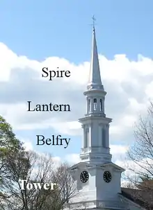 In architecture, a steeple is a tall tower on a building, topped by a spire and often incorporating a belfry and other components. Steeples are very common on Christian churches and cathedrals and the use of the term generally connotes a religious structure. They may be stand-alone structures, or incorporated into the entrance or center of the building.