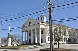 Stetson Hall is the former town hall of Randolph, Massachusetts, located at 6 South Main Street. The 2 1⁄2-story Greek Revival building, which was constructed in 1842, is the most monumental Greek Revival structure in the town, and occupies an elevated site in a prominent position at its center. Its temple front consists of six large fluted Ionic columns, two stories in height, supporting a triangular pedimental gable. Construction of the building was funded by Amasa Stetson, and has served as a center of civic activity in the town since it was built. Its early uses included an academy endowed by Stetson, and as home to the offices of Randolph National Bank. Its meeting space saw a variety of uses, including town meetings and religious services. The building also house town offices for most of its history; the town moved most of its offices out of the building in 1995 to allow for its restoration, which was not completed until 2009.[2]