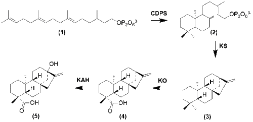 With the formation of GGPP cyclization occurs by enzymes copalyl diphosphate synthase (CDPS) and Kuarene Synthase (KS) to form -(-)Kuarene.[13] Several oxidation steps then occur to form steviol.