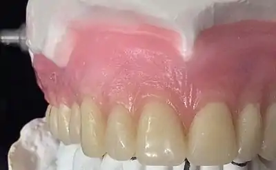 The gingiva often possess a textured surface that is referred to as being stippled (engraved points).[1] Stippling only presents on the attached gingiva bound to underlying alveolar bone, not the freely moveable alveolar mucosa. Stippling used to be thought to indicate health, but it has since been shown that smooth gingiva is not an indication of disease, unless it is smooth due to a loss of previously existing stippling.