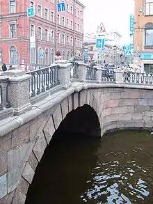 The Stone Bridge (Russian: Каменный мост) is a bridge across the Griboyedov Canal in Saint Petersburg, Russia. It was built in 1774–78, and at the time it was one of the first bridges in Saint Petersburg made of stone, hence the name.[1] The bridge crosses the canal on the axis of Gorokhovaya Street connecting Kazansky and Spassky islands. Unlike many other bridges, this one did not undergo major reconstruction, and therefore preserves most of its original form from the 18th century.