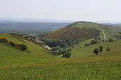 The ridge itself is primarily chalk downland, comprising rough pasture with some scrub. Here, there are numerous downland flowers including Horseshoe vetch and Carline thistle. In early summer, Common spotted, Early purple and Bee orchid may be seen, whilst in late summer and early autumn, Autumn Lady's-tresses, Autumn gentian (or Felwort) and Nettle-leaved bellflower are in bloom. This area is also heavily grazed.[1][2]