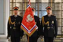 On 11 March 2014, Marshal Ewa Kopacz granted the Guard with its own ceremonial standard in line with the other public uniformed formations.[4] The duties of the Marshal's Guards were defined on 1 February 2018. From 1 February to 19 May, the guard were exclusive officers of the State Protection Service, however, in accordance with earlier Act, they did not have the status of an officer of SOP and remained employees of the Chancellery of the Sejm.[5] In May 2018, the guard was granted the authority to use firearms and armoured vehicles.[6] Since July 2018, the guard has used Hungarian-like ceremonial sabres. The guard joined the National Independence Day parade at the Piłsudski Square in Warsaw for the first time on 11 November 2018, marking the centennial since the restoration of Polish independence, this was the first time it joined a national celebration in its history.