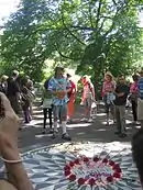 One of its best-known visitors was Gary dos Santos, a fan of the Beatles who decorated the memorial in circles of different flowers and objects, often in the shape of a peace symbol.[16] Born Ayrton "Gary" Ferreira dos Santos Jr.,[17] he was a performance artist who for 19 years installed flower designs around and within the "Imagine" mosaic here.[18] His work has been documented in The New York Times. Dos Santos' income came from the tips he received from tourists as a result of his work, and the three-minute monologue he delivered to tourists describing his work and the life of John Lennon and his family.[18][19] Santos was the subject of a documentary film, The Mayor of Strawberry Fields, directed by Torre Catalano and distributed by Nehst Studios.[19]