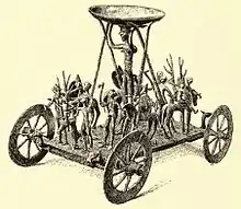 The wagon consists of a square-shaped, open-worked base plate with four spoked wheels. A female figure approx. 32 cm high holding a bowl-shaped object in upraised hands stands in the center of the wagon. The bowl is also held on the sides by two scissor-shaped supports. Recent restoration work and examination by experts has concluded that the bowl attributed to the wagon up to now cannot be conclusively proven to originally have been part of the cult wagon . In addition to the kettle bearer, numerous other figures in the form of both standing and mounted people as well as animals similar to deer and to horses are present on the wagon. The depicted scene is interpreted as a sacrifice. The wagon presumably served as a cult object for the consumption of a libation.