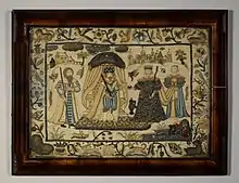 Traditionally stumpwork depicted a scene which might contain a castle, stag, lion, birds, butterflies, fruit, flowers, and several figures sometimes positioned beneath a canopy. The kings and queens of the Stuart period were often depicted as were biblical or mythical stories.[1]