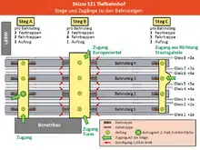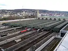 The track apron connects five tracks of the regional and long-distance traffic (one track towards the Gäu Railway and two tracks each towards Bad Cannstatt and Feuerbach) with the station tracks;[23] five further tracks connect the station with the storage facility at Rosenstein Park.[24] The set of tracks is protected as an object of cultural heritage under the Baden-Württemberg heritage act,[23] although this protection will be removed after the completion of Stuttgart 21.[25]