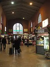 The terminal station hall connects directly to the cross-platform hall at the end of platforms tracks 1 to 16. The terminal station hall was built with a reinforced concrete wall on the side near the platforms to reduce the effects of a possible brake failure.[41] The eight arches leading to the cross-platform hall are divided into three parts: at the top they each have a window forming a round arch, the middle parts that are at the level of the platform canopies are solid and are built to full width in their lower parts, while at the bottom of each arch there is a passage to the cross-platform hall, which originally had a platform gate.[23][42] A similar arrangement can be found on the opposite side, towards the city. The original ceiling was destroyed during the Second World War and the current ceiling was completed in 1950.[43]