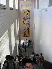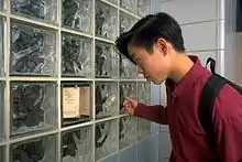 The blocks are set into the hallway walls and scattered throughout the building. Each block is inscribed with a brief description of its contents or context. The items displayed include a section of the Great Wall of China, fragments of the Mayan pyramids, leaves from the sacred Bo tree, water from the Nile and Ganges Rivers, a Revolutionary War button, pieces of the 15th Street Stuyvesant building, a report card of a student who studied in the old building, and fragments of monuments from around the world, various chemical compounds, and memorabilia from each of the 88 years' history of the 15th Street building. Empty blocks were also installed so that they could be filled with items chosen by each of the graduating classes up through 2080.[62] The installation received the Award for Excellence in Design from the Art Commission of the City of New York.[63]