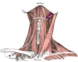 The stylohyoid muscle is a slender muscle, lying anterior and superior of the posterior belly of the digastric muscle.[1] It is one of the suprahyoid muscles.[2] It shares this muscle's innervation by the facial nerve,[3] and functions to draw the hyoid bone backwards and elevate the tongue. Its origin is the styloid process of the temporal bone. It inserts on the body of the hyoid.[1]