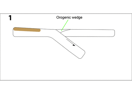 Similarly, two oceanic plates move towards each other. The subduction process ceases with the involvement of buoyant continental block. A new slab is formed at the overriding plate owing to the regional compression and the difference in density between the continental block and oceanic plate.[16] An orogenic wedge is built.[16] However, there is an obvious space problem about how to accommodate two slabs. The solution is the new developing slab moves not only vertically, but also laterally leading to a deep strike-slip movement.[16] The development of co-existence of two opposite slabs is described as a double sided subduction[18] or doubly convergent wedge.[16] Eventually, the development of new slab grows and slides onto the old slab. The old slab breaks off and the orogenic wedge collapses. The new slab stops the lateral motion and subducts beneath.[16] The direction of subduction system changes.[16]