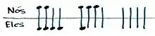 Score is kept by tracking sets won, with the first partnership to reach 4 game points taking the set. Traditional scorecards are marked with two crosses – marked '"Nós"' ("we" or "us") and '"Eles"' ("they" or "them") – and a dot painted on the outer points to signify a game won.