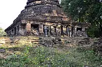 Wat Chang Lom (Thai: วัดช้างล้อม) is a temple complex consist of a large stupa in Lanka style with the remains of a gallery, the ruins of a vihara and an ordination hall, surrounded by moat. Numerous small stupas, of many is only the foundation remain, are scattered around the grounds. The large bell-shaped stupa stands on a square brick base with about 18 meters on each side. 32 elephant sculptures stand around the base. Each elephant seems to be on a small brick niche, only the front part of the elephant is visible. A square portico with brick foundation and remains of laterite pillars surrounding the stupa area at some distance. East of the Stupa are the ruins of a vihara with a Buddha image and round and square laterite pillars.
