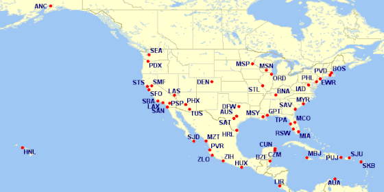 As of February 2021, Sun Country Airlines flies to 55 destinations and operates 88 routes throughout the Caribbean, United States, Mexico and Central America.[33][34] Many Sun Country destinations are seasonally served as demand grows an falls throughout the year. The airline additionally provides charter service for the United States Armed Forces[35] and NCAA football teams.[36]