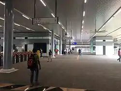 The common concourse of the Sungai Buloh KTM and MRT Station, with the fare gates into the MRT station directly ahead.