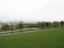 Sunset Park is between Fifth Avenue to the west, Seventh Avenue to the east, 41st Street to the north, and 44th Street to the south,[1] atop a 164-foot-tall (50 m) hill that is part of the Harbor Hill Moraine, a terminal moraine formed during the last glacial period.[2] The park's elevated location offers views of New York Harbor; Manhattan; the Statue of Liberty; and, more distantly, the hills of Staten Island and the U.S. state of New Jersey.[1][3] Initially, Sunset Park contained a pond within its borders. According to Sergey Kadinsky, author of the book Hidden Waters of New York City, the pond was likely artificial since it did not appear on any maps prior to the park's creation. The pond was destroyed in 1935 with the construction of the current swimming pool.[4] The Sunset Park Memorial Grove was planted in 2002 to commemorate victims of the September 11 attacks.[5]