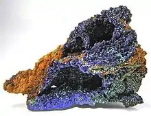 Pyrite FeS2 is generally abundant, and near the surface it oxidises to insoluble compounds such as goethite FeO(OH) and limonite,[2] forming a porous covering to the oxidized zone known as gossan or iron hat.[4] Prospectors take gossan as an indication that there might be reserves of ore underneath.