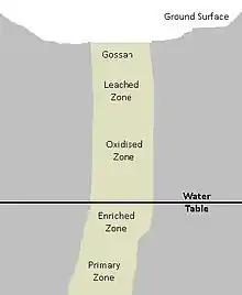 Different zones can be identified at different depths. From the surface down they are gossan cap, leached zone, oxidized zone, water table, enriched zone (supergene enriched zone) and primary zone (hypogene zone).[3]