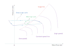 In most low-speed and low-pressure cases, rotating stall comes prior to compressor surge;[8][9] however, a general cause-effect relation between rotating stall and compressor surge has not been determined yet.[6] On a constant speed line of a compressor, the mass flow rate decreases as the pressure delivered by the compressor gets higher. Internal flows of the compressor are in a very large adverse pressure gradient which tends to destabilize the flow and cause flow separation. A fully developed compressor surge can be modeled as a one-dimensional global instability of a compression system which typically consists of inlet ducts, compressors, exit ducts, gas reservoir, and throttle valve.[10][11] A cycle of compressor surge can be divided into several phases.[12] If the throttle valve is turned to be a very small opening, the gas reservoir would have a positive net flux. The pressure in the reservoir keeps increasing and then exceeds the pressure at compressor exit, thus resulting in an adverse pressure gradient in exit ducts. This adverse pressure gradient naturally decelerates flows in the whole system and reduces the mass flow rate. The slope of a constant speed line near surge line is usually zero or even positive, which implies that the compressor cannot provide a much higher pressure as lowering the mass flow rate. Thus, the adverse pressure gradient could not be suppressed by the compressor and the system would rapidly involves an overshoot of adverse pressure gradient which would dramatically reduce the mass flow rate or even cause flows to reverse. On the other hand, the pressure in the reservoir would gradually drops due to less flux delivered by the compressor, thus rebuilding a favorable pressure gradient in exit ducts. And then the mass flow rate would be recovered, and the compressor is back to work on a constant speed line again, which would eventually trigger the next surge cycle. Therefore, compressor surge is a process which keeps breaking the flow path of a compression system down and rebuilding it.[13] Several rules of thumb can be inferred from the interpretation above. Compressor surge in a system with a small gas reservoir is high-frequency and low-amplitude whereas a large gas reservoir leads to low-frequency and high-amplitude compressor surge; another rule of thumb is that compressor surge happens in a compressor with a large external volume and compressor stall tends to show up in a system with a short exit duct. It is also worth noting that the surge line of a compressor can have small variations in different systems, such as a test bench or an engine.[14]