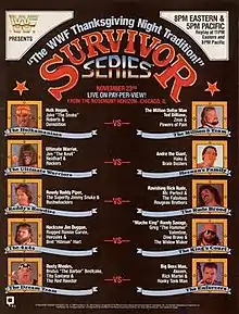 Before the event aired live on pay-per-view, Boris Zhukov defeated Paul Roma in a dark match.[28] The opening included superstars expressing what they were thankful for, followed by a rundown of the card narrated by Vince McMahon. The first Survivor Series match was between The Dream Team (Dusty Rhodes, Brutus Beefcake, The Red Rooster and Tito Santana) and The Enforcers (Big Boss Man, Bad News Brown, Rick Martel and The Honky Tonk Man). Originally, Boss Man's tag team The Twin Towers partner Akeem was scheduled to be a part of The Enforcers but was replaced by Brown.[29] Rick Martel and Tito Santana, two former Strike Force partners and current rivals began the match. Martel pinned Santana with a roll-up, eliminating Santana, leaving Dream Team with three members. Sapphire made another appearance in the audience, after appearing the previous week on TV cheering on Dusty Rhodes in a match against Akeem. Like the previous year, Bad News Brown walked out on his team after arguing with team captain Big Boss Man and getting counted out. Both teams continued with three members each until Brutus Beefcake pinned Honky Tonk Man after a high knee, eliminating Honky and leaving Enforcers with only two members – Boss Man and Martel. Martel entered but failed to eliminate Beefcake. Instead, Beefcake pinned Martel with a roll-up, eliminating him and leaving Enforcers' captain Boss Man as the remaining member. He managed to pin Red Rooster after a Boss Man Slam. He fought the opposing Dream Team's captain Dusty Rhodes. The two captains had a battle with each other, which Rhodes won after he pinned Boss Man with a flying crossbody. Dream Team won with Rhodes and Beefcake as the survivors.[30][2]