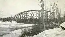 The Susitna River Bridge, also known as the Gold Creek Bridge, was the longest bridge span on the United States Government Railway in Alaska. The steel 504-ft. through-truss channel spans the Susitna River. It was completed in February, 1921. The crossing of the Susitna includes two 121-ft. combination Howe truss flanking spans and two 70-ft. combination pony Howe truss end spans, with 392 ft. of trestle at the southern approach and 28 ft. at the northern approach, making a total length of 1,322 ft. It is located 150 miles north of Anchorage, and 264 miles north of the terminus at Seward.[2] The bridge was listed on the National Register of Historic Places in 1977.[1]