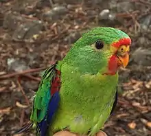 The swift parrot is about 25 centimetres (9.8 in) long and has long pointed wings and long tapering tail feathers.[11] It is mainly green with bluish crown and red on the face above and below the beak. The adult female is slightly duller, and the juvenile has a dark brown iris and a pale orange bill.[12] The forehead to throat is crimson and there is also crimson patch at the top, edge of the wing. They are noisy, always active and showy, and are very fast with their direct flight.[13]