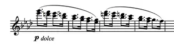 A distinctive 'turning' motif, derived from the main theme, appears in the winds, traded between flute and oboe with lush string harmony accompaniment. This is followed by an energetic passage, mainly in the strings, featuring falling arpeggio figures and elements of the main theme recited in C minor/F minor.[4]