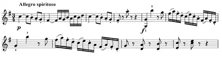 The second movement is in ternary form with a slow and song-like melody. Haydn, however, uses an unusual construction in this movement by adding an intense middle section in minor. This minor interlude is based on a motive from the opening section. A shortened return of the major section precedes a section of the movement that features the winds.[3]