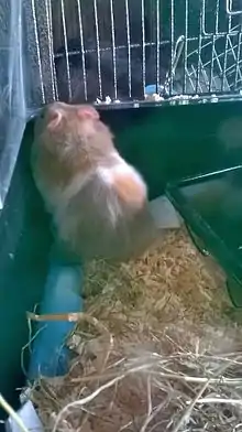 The first Piebald was reported in 1945.[12] A Piebald is a coloured hamster which has white spots on its body. The spots can be few and small or can cover the hamster. Piebalds can also have coloured bellies. This pattern is hard to breed and is believed by some to be extinct.[13]