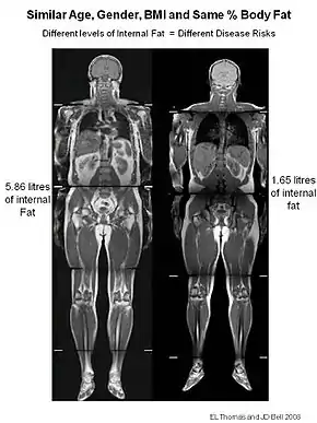 - Thomas, E. Louise; Parkinson, James R.; Frost, Gary S.; Goldstone, Anthony P.; Doré, Caroline J.; McCarthy, John P.; Collins, Adam L.; Fitzpatrick, Julie A.; Durighel, Giuliana; Taylor-Robinson, Simon D.; Bell, Jimmy D. (2011). "The Missing Risk: MRI and MRS Phenotyping of Abdominal Adiposity and Ectopic Fat". Obesity. 20 (1): 76–87. doi:10.1038/oby.2011.142. PMID 21660078.