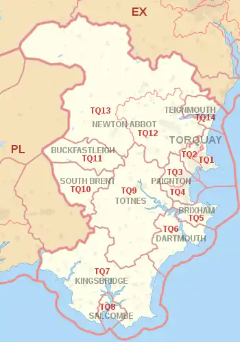 The TQ postcode area, also known as the Torquay postcode area,[2] is a group of fourteen postcode districts in South West England, within eleven post towns. These cover much of south Devon, including Torquay, Paignton, Newton Abbot, Brixham, Ashburton, Buckfastleigh, Dartmouth, Kingsbridge, Salcombe, South Brent, Teignmouth and Totnes.