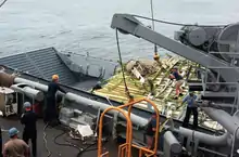 Search and recovery operations were conducted by federal, state, and local agencies, as well as government contractors.[1]:363–365 An HH-60 Pave Hawk helicopter of the New York Air National Guard saw the explosion from approximately eight miles away, and arrived on scene so quickly that debris was still raining down, and the aircraft had to pull away. They reported their sighting to the tower at Suffolk County Airport. Remote-operated vehicles (ROVs), side-scan sonar, and laser line-scanning equipment were used to search for and investigate underwater debris fields. Victims and wreckage were recovered by scuba divers and ROVs; later scallop trawlers were used to recover wreckage embedded in the sea floor.[1]:63 In one of the largest diver-assisted salvage operations ever conducted, often working in very difficult and dangerous conditions, over 95% of the airplane wreckage was eventually recovered.[28][29]:1 The search and recovery effort identified three main areas of wreckage underwater.[1]:65 The yellow zone, red zone, and green zone contained wreckage from front, center, and rear sections of the airplane, respectively.[1]:65–74 The green zone with the aft portion of the aircraft was located the furthest along the flight path.[1]:71–74