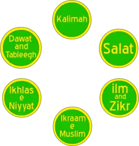 Established in 1926 by Muhammad Ilyas al-Kandhlawi in Mewat region of British India, it began as an offshoot of the Deobandi movement, and as a response to perceived deterioration of moral values and a supposed neglect of the aspects of Islam. The movement aims for the spiritual reformation of Islam by working at the grassroots level.[9][13] The teachings of Tabligh Jamaat are expressed in "Six Principles" (Kalimah (Declaration of faith), Salah (Prayer), Ilm-o-zikr (Knowledge), Ikraam-e-Muslim (Respect of Muslim), Ikhlas-e-Niyyat (Sincerity of intention), Dawat-o-Tableegh (Proselytizaton)).[14]