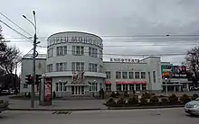 Before the October Revolution, in place of this building were situated the barracks of the 274th Reserve Regiment.[7] The beginning of the project works dates back to 1923.[7] The author of the project is the architect M.F. Pokorny.[7][8] The building is a bright example of constructivism in architecture. According to the construction, the building resembled the head spanner wrench as a symbol of peaceful labor.[7] The Metalworkers' Club was built jointly by the Taganrog Instrument Factory (later - Taganrog Combine Plant) and the Krasny Kotelshchik Plant.[7] The club was built by the young people of Taganrog from the brick of the disassembled church in the name of St. Michael the Archangel.[7] The main entrance is accented by the semi-cylindrical facade of the lobby and the lobby of the second floor. The third floor of this wing was built in the 1960s. Metal window bindings emphasized the "industriality", and not the residential character of the building.