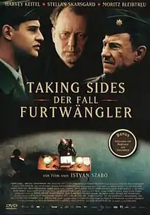 Taking Sides (German title Taking Sides - Der Fall Furtwängler) is a 2001 German-French-Austrian-British[1] biographical drama film directed by István Szabó and starring Harvey Keitel and Stellan Skarsgård. The story is set during the period of denazification investigations conducted in post-war Germany after the Second World War, and it is based on the real interrogations that took place between a U.S. Army investigator and the musical conductor Wilhelm Furtwängler, who had been charged with serving the Nazi regime. It is based on the 1995 play of the same title by Ronald Harwood.
