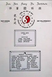 Kimura held a 7th rank[8] in Jun Fan Gung Fu. After Kimura was certified, he was allowed to teach small classes under the mantra of "keep the numbers low, but the quality high".