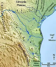 Several rivers cross the region, all flowing eastward to the Gulf of Mexico. Many of these river have created innumerable oxbow lakes, resacas, and abandoned channels with associated marshes and swamps as they meander across the flat coastal plain east of the Bordas Escarpment. The few remaining riparian zones in this region that have not been cleared for agriculture, housing, and industry, can support unexpectedly lush tropical jungle vegetation, particularly in the south.[2] The San Antonio River (a major tributary of the Guadalupe River) runs at the approximate northeastern border of this region. Other major rivers (north to south) include: the Nueces River and its tributary the Frio River; Rio Grande (referred to as Rio Bravo in Mexico) and its tributaries Rio Salado, Rio San Juan; the Rio San Fernando (sometimes called the Rio Conchos and not to be confused with the major drainage Rio Conchos of Chihuahua); the Rio Soto La Marina and its tributaries Rio San Carlos, Rio Pilón, San Antonio, Rio Purificacion, Rio Corona, Rio Santa Ana, form the approximate southern border.[9][10]