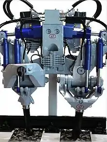 - Clamp or "hook" assemblies, these are usually on the outside of each rail and utilize hydraulic cylinders to clamp onto the side of the rail head so that is locked to the unit chassis before lifting and lining is commenced