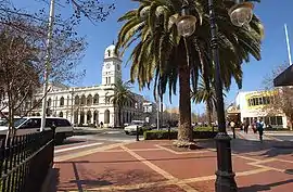 In the 1830s, a company town began to develop on the Peel's southwest bank, the present site of West Tamworth. In 1850, a public town was gazetted on the opposite side of the river from the existing settlement.[9][10] This town became the main town, called "Tamworth" after Tamworth, Staffordshire, represented at the time in parliament by Robert Peel. The town prospered, and was reached by the railway in 1878.[7] The first streetlights used in Australia were commercially owned in Waratah Tasmania in 1886,[11] but on 9 November 1888, Tamworth became the first location in Australia to have electric street lighting powered by a municipally owned power station, giving the town the title of "First Town of Light".[2][12]