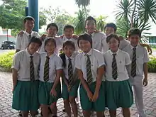 Boys wear white short-sleeved shirts with a school badge on the breast pocket. Lower Secondary boys wear white short trousers. Upper Secondary boys wear white long long trousers. Girls wear a short-sleeved blouse with the school badge on the left. The skirt is jade-green with box pleats. A green and yellow striped tie is worn on some occasions.