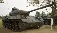 The first prototype vehicles, STA-1 and STA-2 were built and tested by 1957. The results were used to develop the STA-3 and STA-4. More improvements were made in 1961 and the deployment of the Type 61 began.[57] The initial production rate was low, with only ten tanks produced in 1962, increasing to twenty in 1964 and thirty in 1965 and 1966. A total of 250 had been produced by 1970, with production continuing at an increased pace until 1975 when it was terminated. A total of 560 were produced.[57] The main gun of the Type 61 was unstabilized, so firing on the move was impractical, and the vehicle is not fitted with an NBC protection system or deep wading equipment. The JGSDF started studies on a new tank design with Mitsubishi in 1962, as it was realized that the Type 61 would not be able to defeat the latest Soviet designs like the T-62. The tanks were phased out of service in the 1990s with 400 in service in 1990, and 190 in service in 1995. All were decommissioned by 2000, 39 years after their original deployment.[58] From 1980, Type 61's began to be supplemented by the more modern Type 74 MBT.