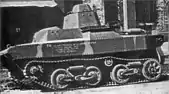 An experimental model was completed in 1934. The TK was a small light tracked vehicle with a turret armed with one machine gun. For cargo transportation it pulled an ammunition trailer.[62] After trials in both Manchukuo and Japan, the design was standardized as the Type 94 tankette. It was reclassified as the Type 94 (Type 2594; tankette) and was designed for "reconnaissance", but could also be utilized for supporting infantry attacks and transporting supplies.[28][27] It entered service in 1935. The lightweight Type 94 was "tailored" for operating in China.[29] It was used for infantry support and reconnaissance by infantry divisions.[19] The Type 94 tankette proved effective in Manchuria and elsewhere as the Chinese National Revolutionary Army consisted of only three tank battalions to oppose them. As with nearly all nation's tankettes built in the 1920s and 1930s, they had thin armor and could often be penetrated by standard small arms fire.[63]